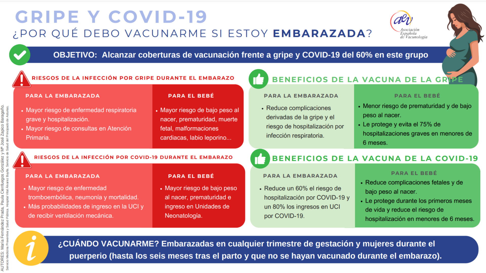 Para alcanzar el objetivo del 60% de cobertura, desde la Asociación Española de Vacunología hemos creado una infografía basada en un documento del Servicio de Salud del Principado de Asturias. Esta herramienta detalla los riesgos de estas enfermedades para embarazadas y bebés, así como los beneficios de vacunarse.