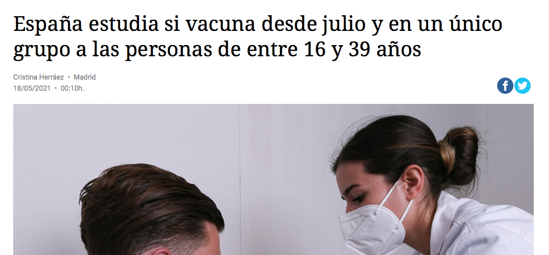 España estudia si vacuna desde julio y en un único grupo a las personas de entre 16 y 39 años