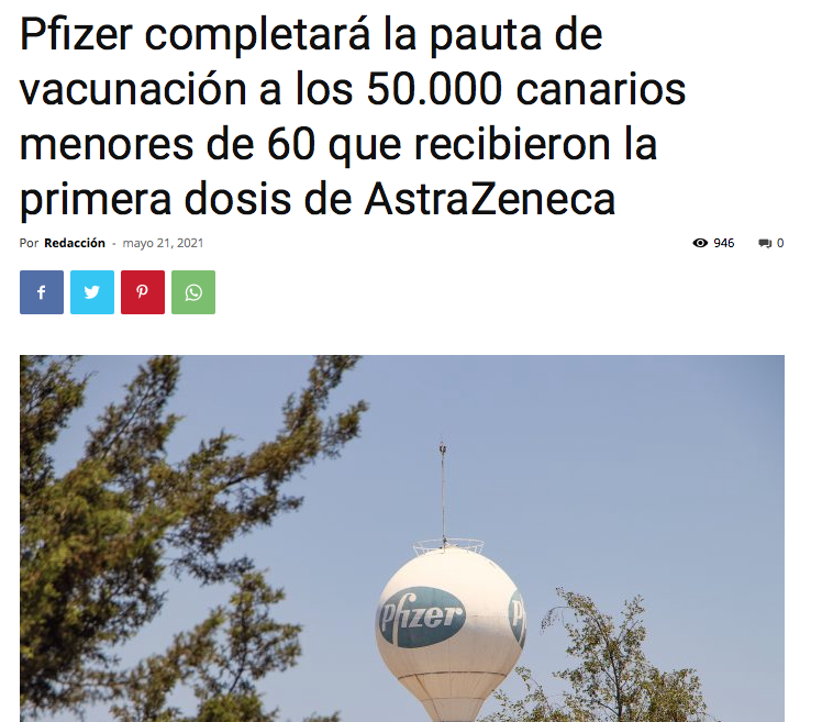 Pfizer completará la pauta de vacunación a los 50.000 canarios menores de 60 que recibieron la primera dosis de AstraZeneca